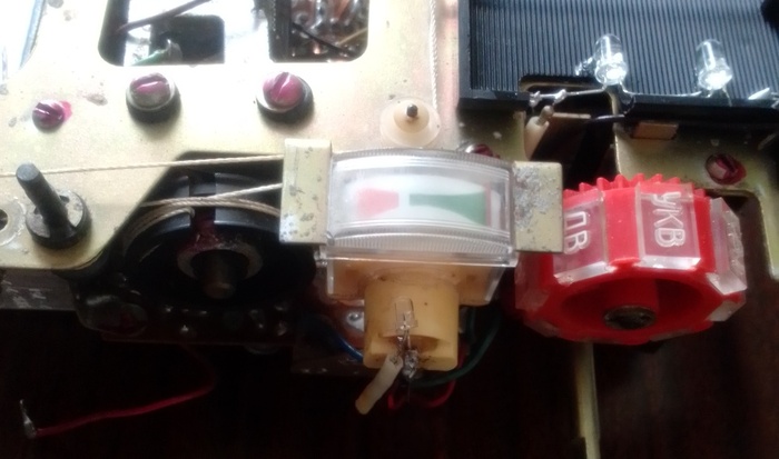 Лампы подсветки были горелые обе (!) Как это произошло, учитывая то, что подключены они последовательно - загадка. Ламп 2,5V 0,068А (да, настолько они там слабенькие) у меня не нашлось, да и, помня, как они (недо)освещали шкалу в этих Океанах, решено было поставить вместо них светодиоды на задний фон шкалы