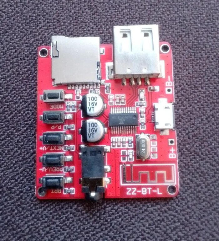 Mp3-плеер, играющий музыку с USB- или microSD-флэшки, и Bluetooth приёмник с A2DP (т.е., подключается как BT-наушники/колонка). Питание от 3,7 до 5V. Можно от li-ion аккумулятора. Если аккумулятор подключить к контактам B+ и B-, заряжать его от microUSB здесь будет нельзя, эти контакты запараллелены с контактами питания в разъёме. Аккумулятор нужно будет заряжать чем-то отдельным, с нужной автоматикой заряда! На практике платка работает, начиная где-то от 3,3V. А вот от 3V (2 батарейки по 1,5) включаться не хочет. Да, и при питании от 5V нужна стабилизация - говорят, бывали случаи сгорания даже где-то от 5,2-5,3V.