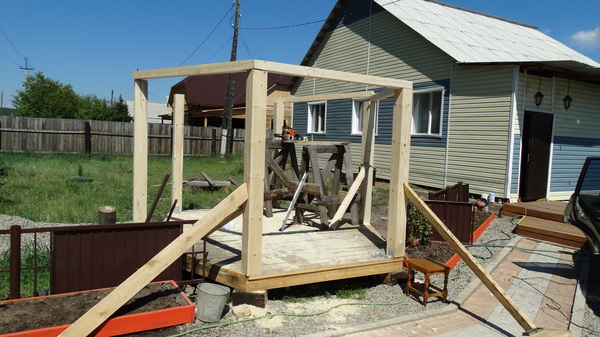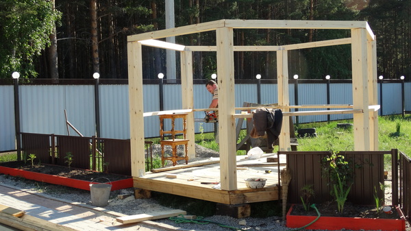 ставим опоры, и обвязку сверху, ничего сложного, если есть кому держать...