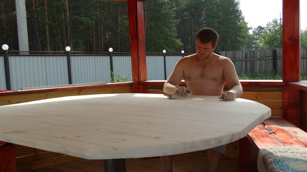 В столярке склеили столешницу 1,7 х 1,9. Пока держится. Брал у знакомого шлефовальный станок, крупное зерно прогонял на нем, а мелкое зерно добивал руками. Потому что ленты оказались короче, чем нужно. Вообще в нашем городе часто не приходится выбирать материалы для работы, а брать то что есть. Это удручает =(