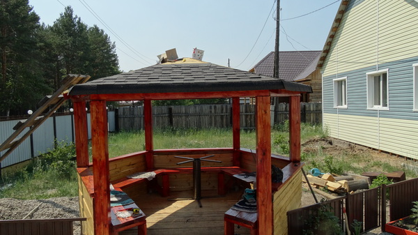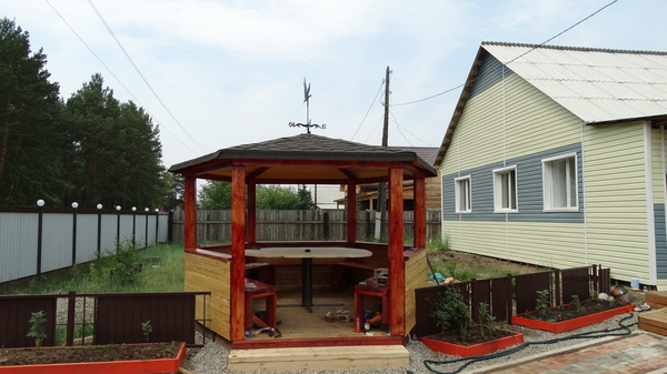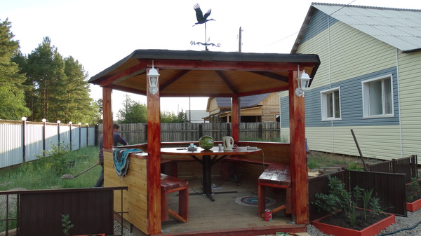 Провели электричество, отдельное освещение в самой беседке+ освещение для дорожки. Установил 2 розетки и перенес поближе Wi-Fi. Теперь там стоит самовар электрический и заварник. В общем своя беседка это, я вам скажу - вещь.