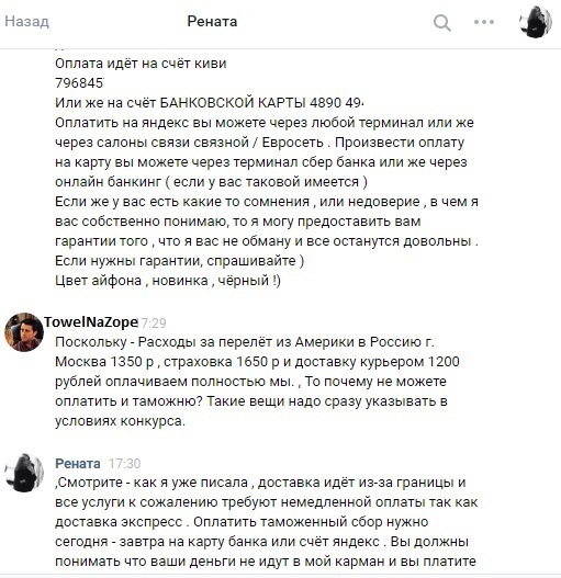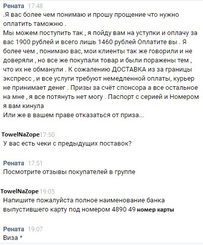 Не знаю точно верить этому или нет, но похоже, т.к. там приписка - Разводит на доставке. Еще на том же контактике нашел еще 3 таких аккаунта с одинаковыми фото. А на странице той (того) с кем переписывался видео (дата три и больше месяца назад) какого-то пацаненка: как он играет в футбол, как он распаковывает фингербординг и еще какая-то фигня с его участием (так и не нашел похожих фото). Если разрешат, выложу ссылки и фамилию с картинкой паспорта (сперли у этой Ренаты наверное). Баянометр ругался на не пойми чего (100% совпадение с половым воспитанием детей).
