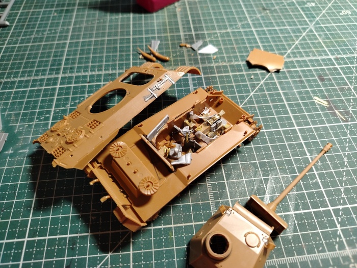 После сборки самой модели, когда всё возможное уже приведено в негодность, катки обточены от бандажей, поломанны, надкусаны. Лишние детали убраны, а недостающие сделаны на 3д принтере танк попадает в покраску.