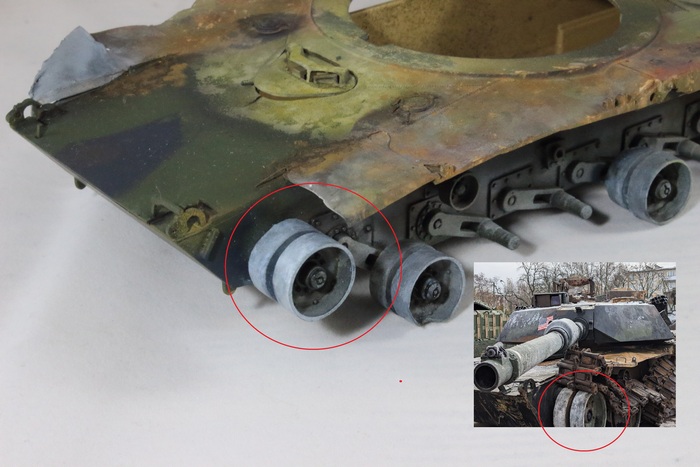 7. На катки после базовых серых слоёв изнутри нанёс разбавленный Nato green и опять же затемнил Тамиевским Smoke.