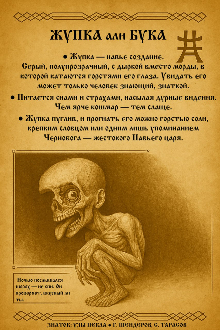 Мы не ограничились «славянщиной по мотивам». Под «Знатком» лежит очень приземленная база: от заонежских способов «помочь колдуну умереть» посредством разбора крыши и севернорусских быличек про суседку и заложных мертвецов – до белорусских верований о «родителях» под голбцом, гыргалицах, кумельганах и бисяках. Мы читали Проппа, «Я из огненной деревни» Адамовича, полевые записи партизанов, фольклорные сборники, труды по народной демонологии и инфернальной иконографии, а потом уже на этом фундаменте выстраивали собственный лор, чтобы нечисть в книге не превратилась в очередной SCCP-бестиарий, а отражала реальные представления об этих существах – пусть и с авторскими детальками.