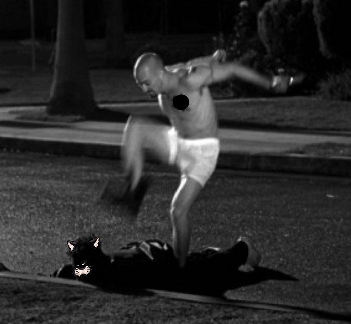 Затем мышиный жмурик берется за хвост и кидается в сторону кошки, от чего последняя мчится на утёк, не ожидая такого внезапного "подарка" себе по морде.