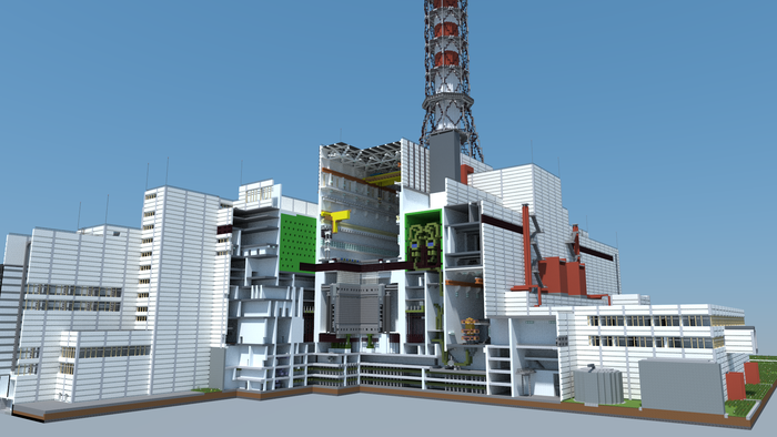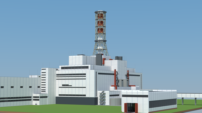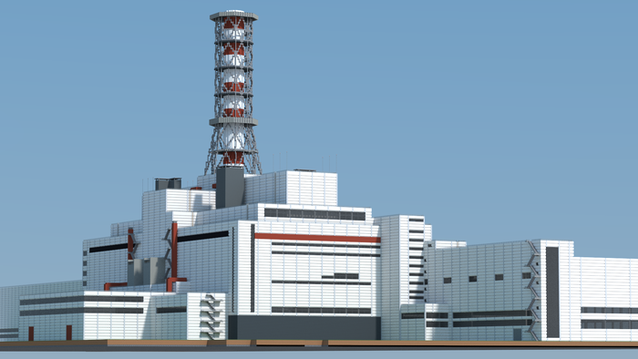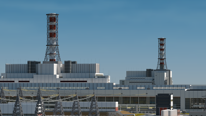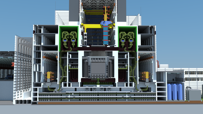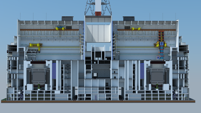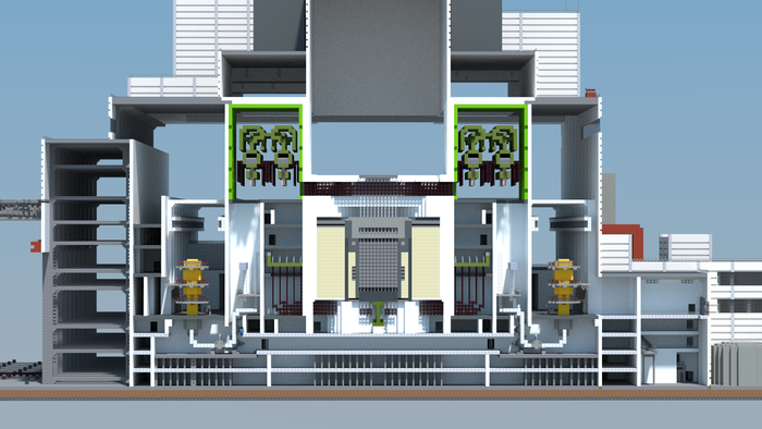 В целом, информация по ЧАЭС и КуАЭС дала общее понимание, какой была бы третья очередь. Наша версия - это блоки РБМК-1000 7 моды с техническими нововведениями. Про них можете прочитать в литературе на сайте библиотеки РосАтома. Отличительная особенность - достроенная до отм. +39.000 пристройка деаэраторной этажерки в осях В1-Д1. В дополнительных помещениях размещаются дополнительные вентиляционные установки.