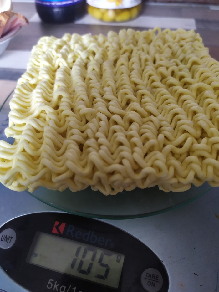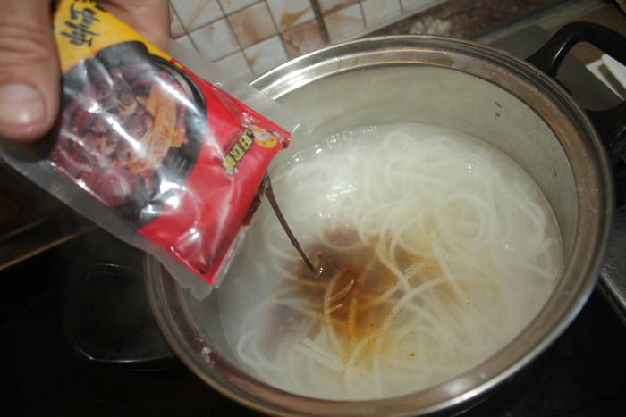 В готовую лапшу добавляем: 186,7 грамм кипятка и всю остальную хрень из пакетов.