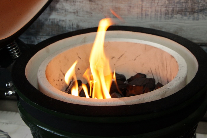 Внутри имеется глиняный горшок для непосредственно углей. Встроенный термометр в зоне барбекю. Сверял с термопарой - не врёт.