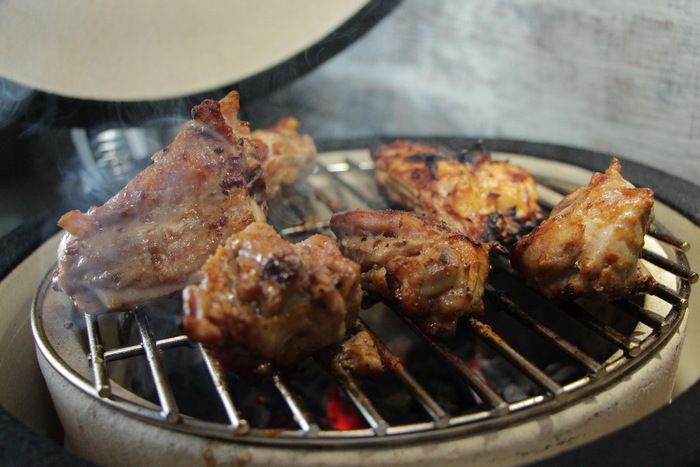 В режиме "мангал" нижнее поддувало открыто полностью. Жар как в обычном мангале. Выкладывам курицу и жарим. Жир капает на угли, горит и успешно уходит в тягу. Получается обычный, сочный шашлык. Главное - не пересушить.