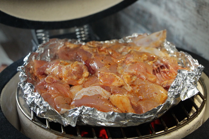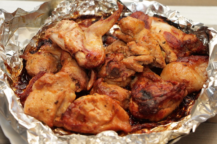 Далее режим с закрытой крышкой. Не смокер. Температура около 200-220 градусов. Та же курица, из того же маринада с солью, черным перцем и луком. Выкладка на фольгу и под закрытую крышку: