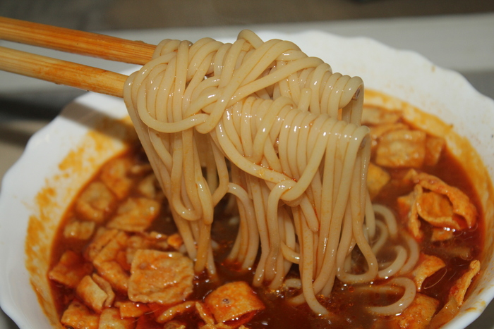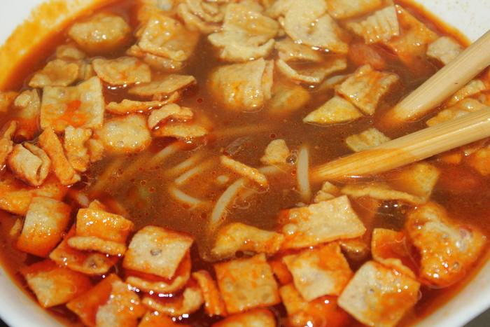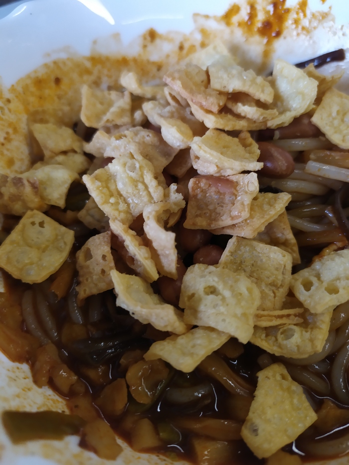 Теперь про лапшу. Она варится долго. Далее без разбавления кипятком, лапшу заливаем бульоном. Это улиточная лапша. Она же «вонючая лапша» из Гуанси-Чжуанского автономного района КНР. Мировая известность! Без добавления острого пакета, лапша заиграла новыми нотами вкуса и, если возможно, блин, аромата. Она по прежнему ВОНЯЕТ! Но, в хорошем смысле слова. Это как добротный вьетнамский рыбный соус, ныак-мам: воняет как говно, на вкус как говно, но аромат после жарки - божественный!