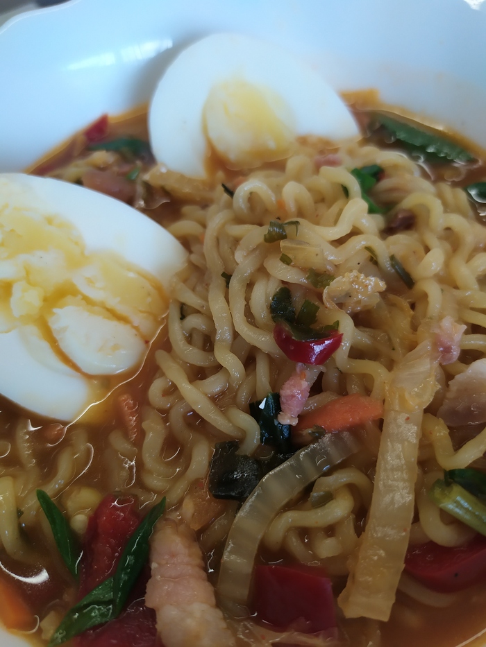 От себя, по совету производителя, добавил кимчи, соленое мясо в виде бекона, перчик и рыбный соус:
