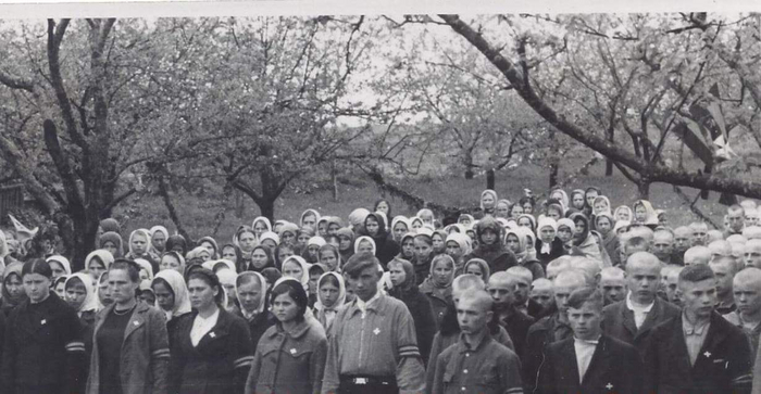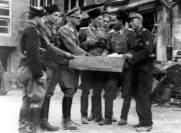 Вот он, предпожительно справа на фото. У него нашивка РОА. То есть он уже в РСФСР начал свою подрывную деятельность. Или это вовсе не он? История умалчивает.