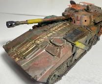 Для проекта я, в дополнение к изкоробке, приобрел печатные траки на пальцах и набор решеток МТО от Микродизайна. Как можно заметить, с решетками намудрил и приклеил их не по инструкции. Все таки современная техника это не моя тема. Эта САУ, можно сказать, первый опыт сборки техники НЕ в рамках Второй Мировой войны. Также по традиции заменил поручни на проволоку, сплел из нее же трос. Траков из набора за 1000 рублей неожиданно не хватило, при сборке некоторая их часть сломалась, а заявленный запас к набору оказался мал или вообще отсутствовал. Хорошо, что все таки проект подразумевал уже побывавшую в боях и подбитую "Гвоздику", недостаток траков удалось списать на полевые потери.