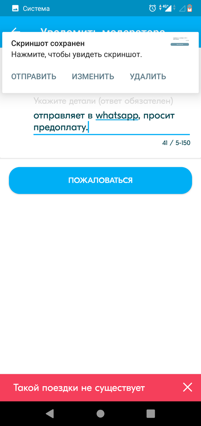 Теперь при попытке написать жалобу на то что при общении водитель отправляет в Whatsapp