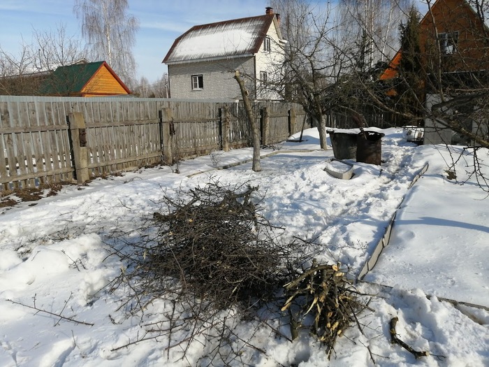 Пока строители возились с выкапыванием ямы, закладкой колец и установкой кибитки, я зачищал площадку для будущей теплицы, осталось только вон ту здоровую палку выкорчевать. Первые дровишки появились.