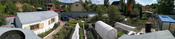 Где-то через час туман осел и я смог сделать с крыши бани панораму того, что изначально было. Трухлявый деревянный забор моя маман решила менять сразу, но она(да и все мы) не догадывалась, что проблемы и в бане, и в доме. Примерно октябрь-ноябрь. После мои огородницы что-то накрыли плёнкой и мы поехали домой.