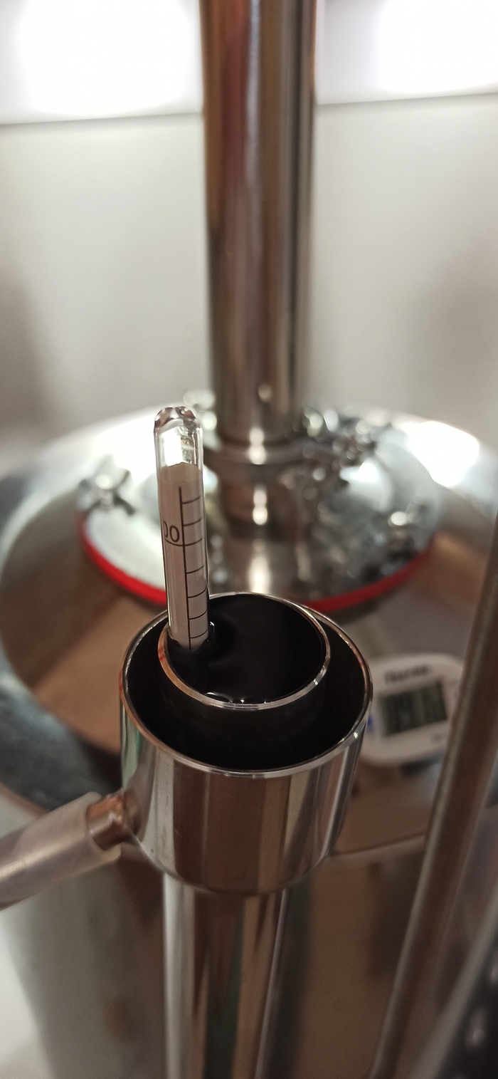 Здесь уместно провести замеры количества спирта в браге, но я суперклал, ибо что получил, то получил, не больше не меньше. Наша задача на этом этапе максимально быстро перегнать нашу бражку в спирт-сырец. Никаких насадок, работаем в режиме, известном как пот-стил. Бак – кипение – трубка – холодильник – приёмная ёмкость. Всё. Ничего лишнего. На баке установлен термометр, когда он покажет, что температура в баке 96 по цельсию, можно начинать мерить спиртуозность в струе. ВАЖНО! Ареометром мерить количество спирта можно только в струе, в банке это делать бесполезно. Многие гонят спирт досуха, пока в струе не будет 10 градусов, лично мне лень. Термометр показал 96 градусов – ауфидерзайн. Мы закончили, слили барду из бачка и залили новую брагу на перегон.