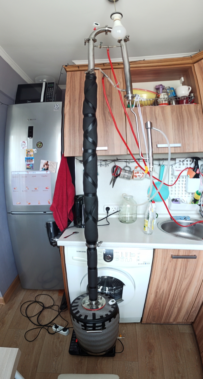 Итак мы собрали аппарат, в моём случае это бак на плите, 1.5 метра царги, дефлегматор, поворотная часть, холодильник, попугай и приёмная ёмкость.