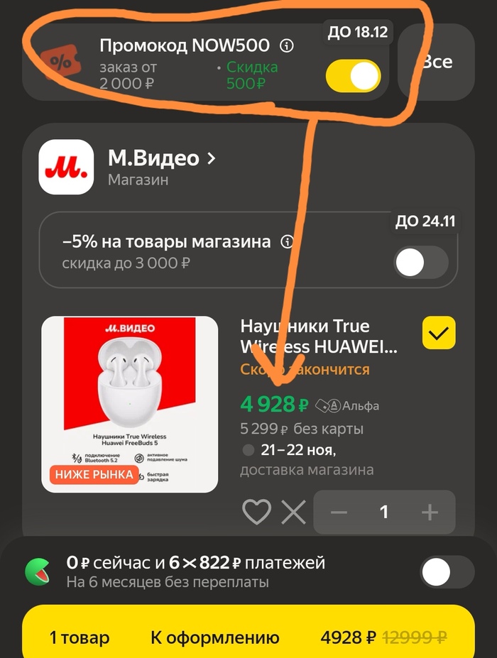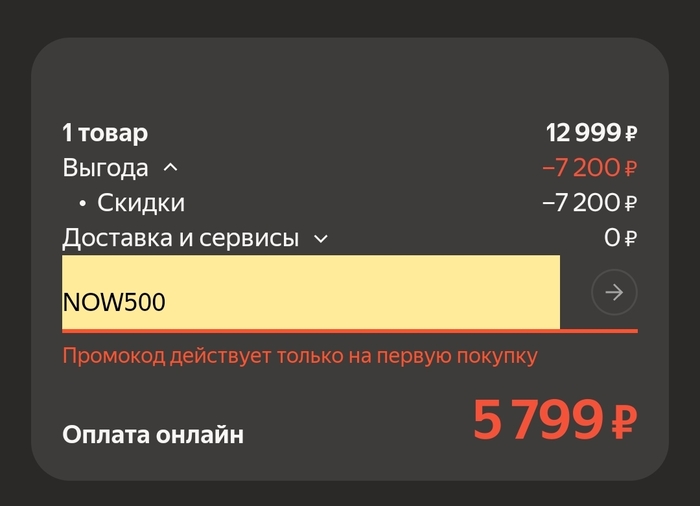 Вот ещё промокод NOW500, который применяется в корзине, ВНИМАНИЕ! - тоже не работает при оформлении. И снова что-то про первую покупку, хотя в правилах условие про те же 180 дней.
