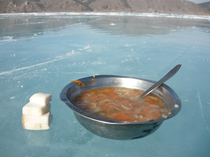 Между прочим, у мыса Ижмей там где гора Жима на Ольхоне находится самое глубокое место на Байкале. Полторы тыщи метров глубины. Прямо туда подойти не смогли из-за торосовых полей, но где-то рядышком расположились на обед. Кто еще может похвастаться, что лежал пузом на льду в самом глубоком месте Байкала и кушал супчик? Да никто. А я могу.