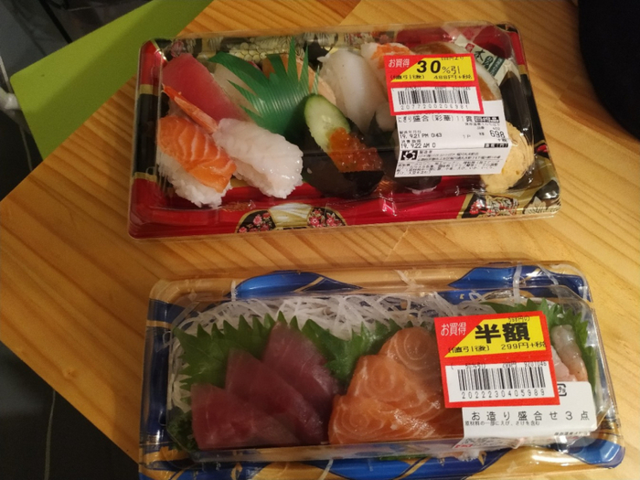 1) Под бюджетным ужином я понимаю поход в ближайший супермаркет (именно супермаркет, не комбини типа 7-11), где на десяти стеллажах с готовой едой после 18-19 начинает твориться магия скидок. Скидки 20-40%, отчего еда становится еще вкуснее. Среди моих личных побед, две пачки суш и сашими со скидкой 30%.