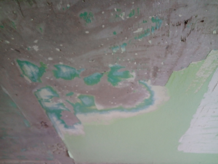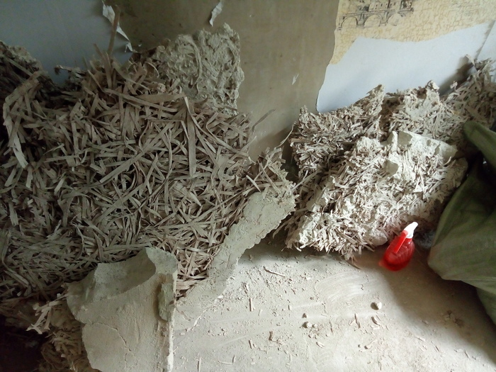 На них слои масляных красок, водоэмульсионных, побелки, шпаклёвки (? что-то гипсовое), клея, обоев и снова краски.