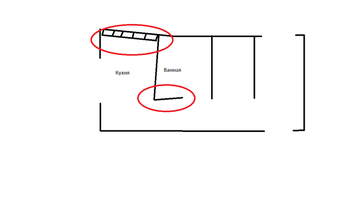 Не художник, поэтому примерно так. Верхний эллипс - в ванной стык двух стен: входная (справа) и кухонная (слева, квадратики - вентиляционные шахты).
