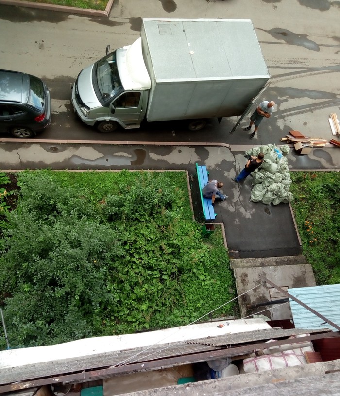 Приехали роботяги. 220+ мешков. На лавочке пивас, за которым они ушли посередине спуска. Не осуждаю, задача реально требует допинга.