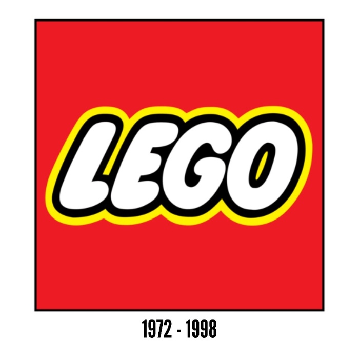 1972 год — момент, когда LEGO наконец говорит: «Ладно, хватит нам экспериментов». И наконец рождается классика. Красный квадрат, белые буквы, двойная чёрно-жёлтая обводка. Никаких компромиссов: крупно, округло, дружелюбно и уверенно. С этой поры логотип перестал искать смысл, он сам стал смыслом.