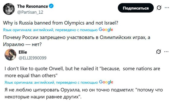 4253 TvoiPasha Политика Двойные стандарты 16 часов назад Пруф 1 - https://aif.ru/sport/eto-drugoe-v-mok-obyasnili-chem-rossiya... Пруф 2 - https://sport24.ru/other/article-822789-pochemu-izrail-yest-... Показать полностью Скриншот X (Twitter) Двойные стандарты Олимпийские Игры Русофобия Политика Израиль Джордж Оруэлл Запад 748 84 15 3 2 2 2 1 1 Ещё 4