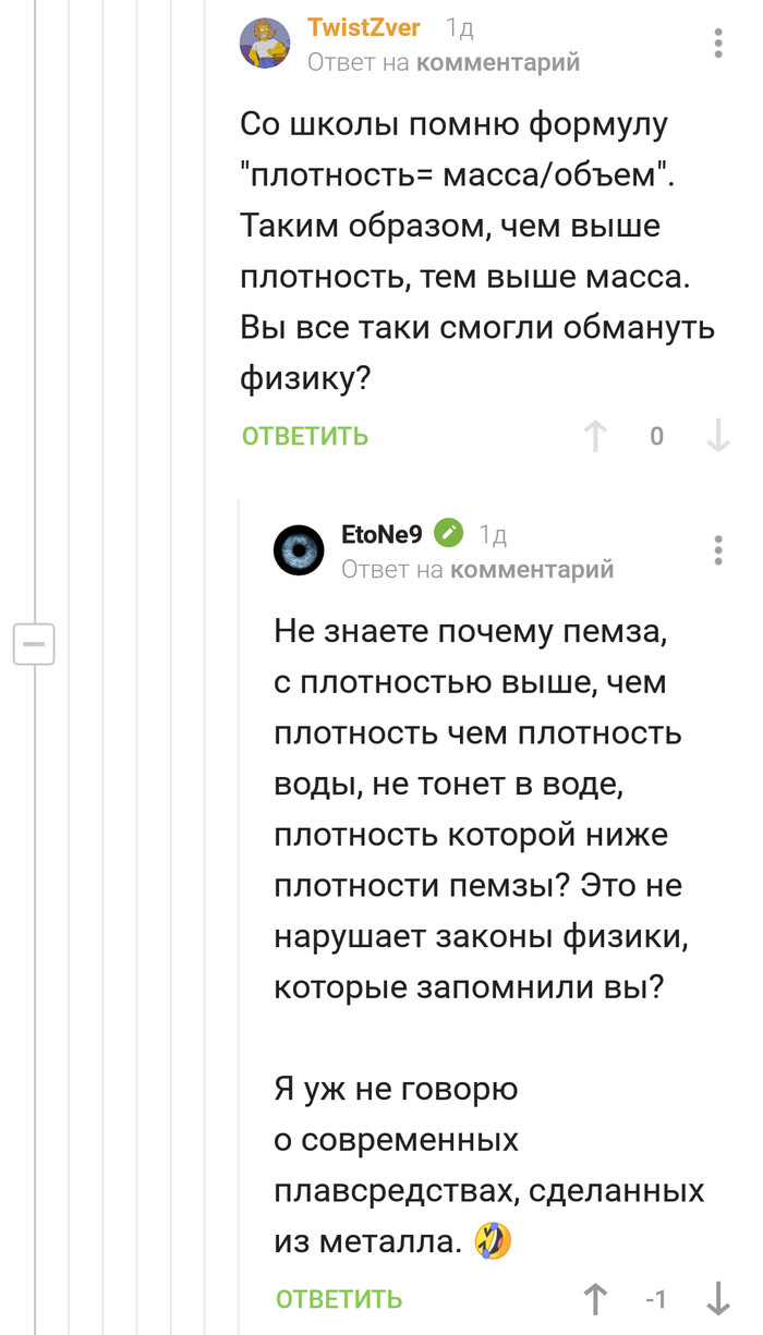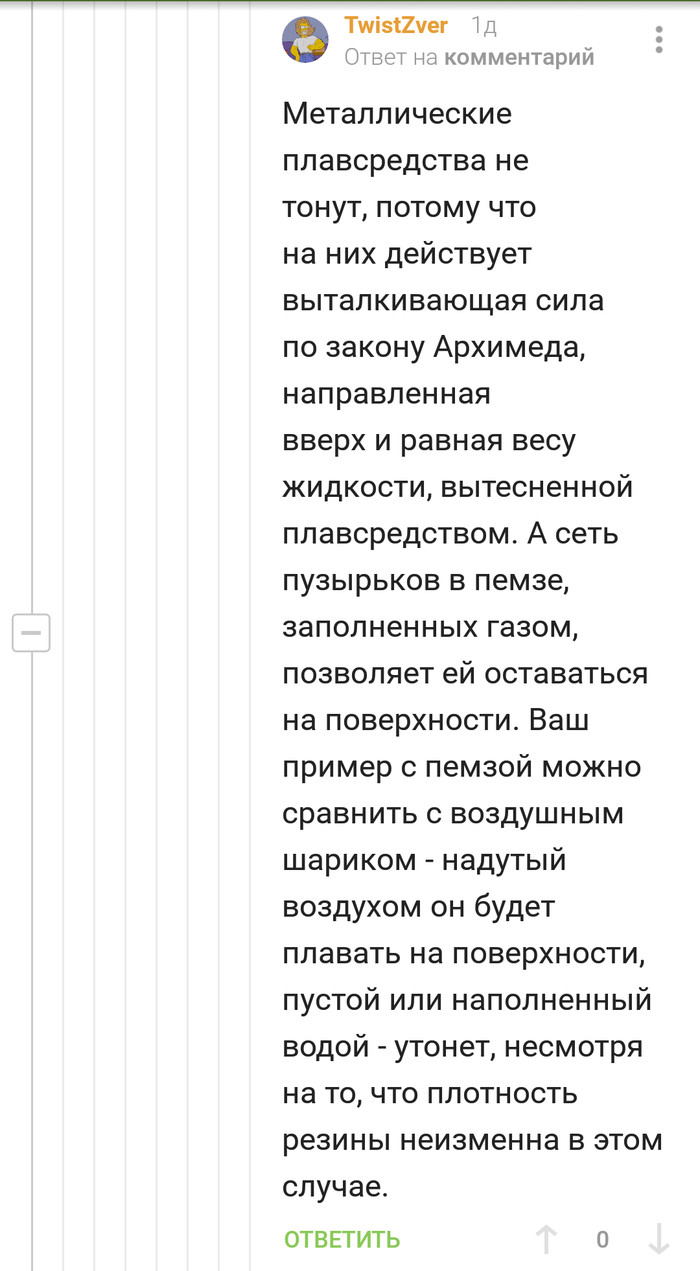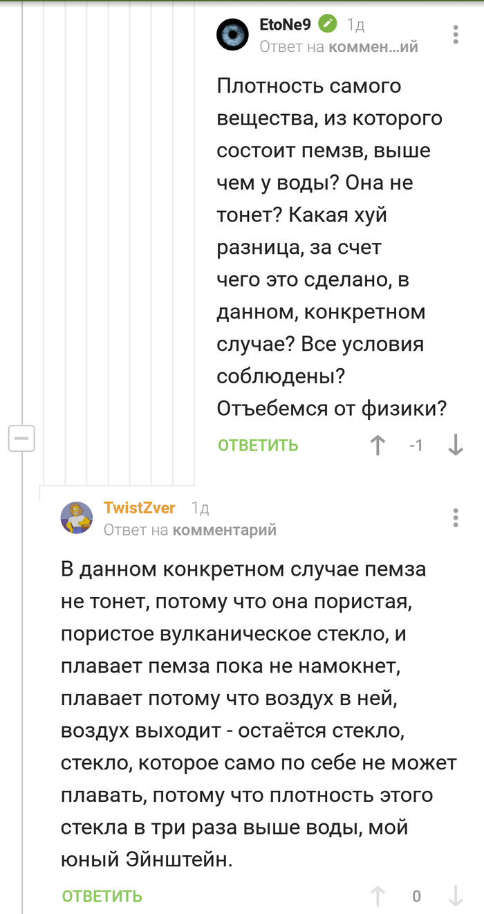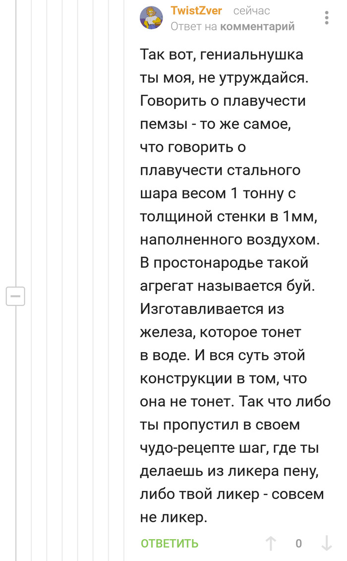 Да, я гуманитарий, и использовал смутные воспоминания за 6 класс и статью про пемзу на Википедии, поэтому почти уверен, что мои аргументы довольно неточны. Но если раньше, когда гость спрашивал: "Ого, а как это оно у тебя не смешивается?" я просто отвечал: "Плотность разная", то теперь мне этого мало. Прошу помощи красноречивых физиков, химиков и алкоголиков - как можно объяснить данный феномен на пальцах, по научному, красиво и витиевато, одним предложением? Возможно с примером, не таким тупым, как мой.