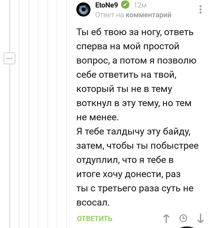 После этого сообщения я понял, что парень меня троллит, и решил продолжить диалог, джаст фо фан. Ещё через пару сообщений засомневался в том, что мы шутим, а когда "чувак" перешёл на мат - я понял, что у нас научная дискуссия, которая исчерпала себя довольно быстро.