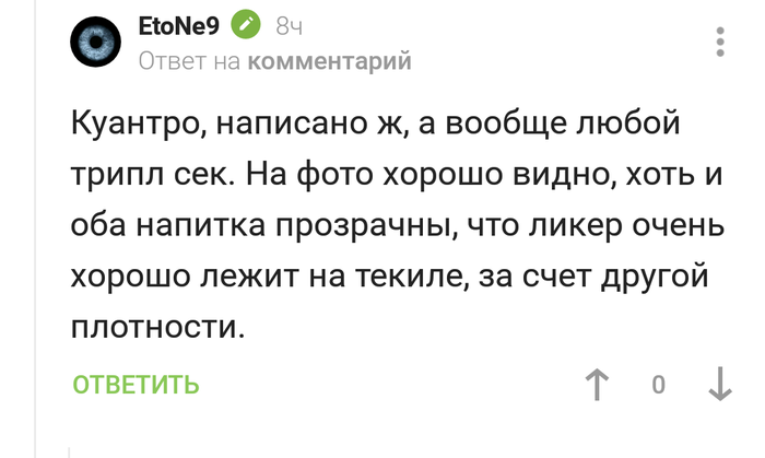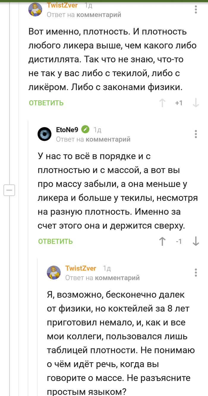 При приготовлении слоистых коктейлей мы руководствуемся плотностью ингредиента - то есть первый слой снизу должен быть самым плотным, и по мере понижения плотности коктейль растет ввысь. Так было всегда - снизу сироп, потом ликер, сверху - крепкий алкоголь. На что и хотел обратить внимание автора. Каюсь, донести я это хотел в шутливой манере, услышав в ответ потешившее мое самолюбие "Ах, ошибся, сейчас поменяю, спасибо".