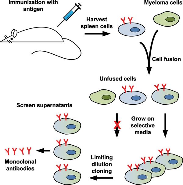 1) Итак, первоначальным этапом любой гибридизации является иммунизация мышей (введение антигена в организм). Существует куча протоколов иммунизаций и гибридизаций, так что я попытаюсь указать суть.