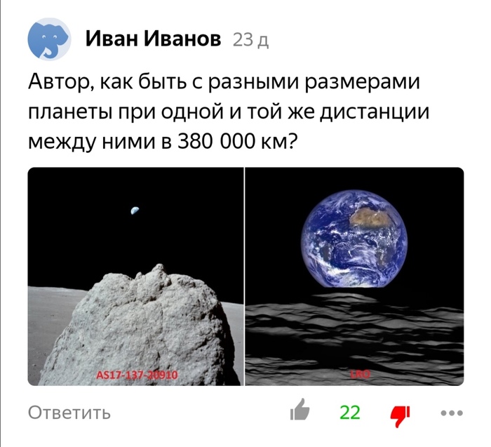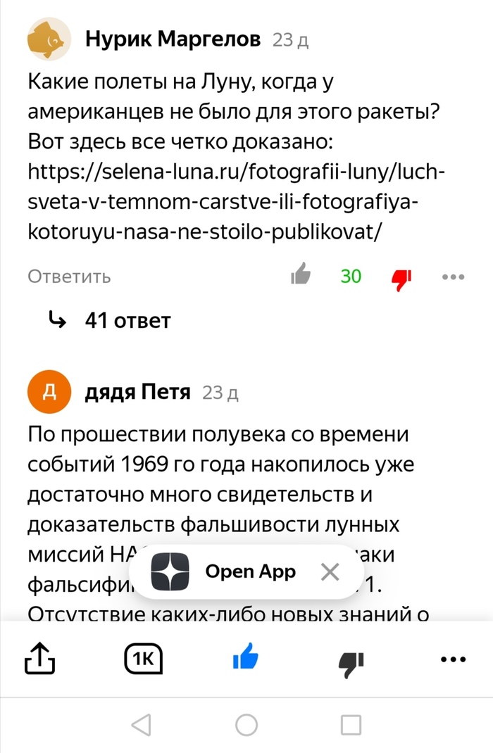 Наткнувшись в Дзене на статью, в которой автор разоблачает некоторые мифы адептов секты "американцы не были на Луне", имел неосторожность заглянуть в комменты: