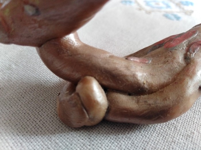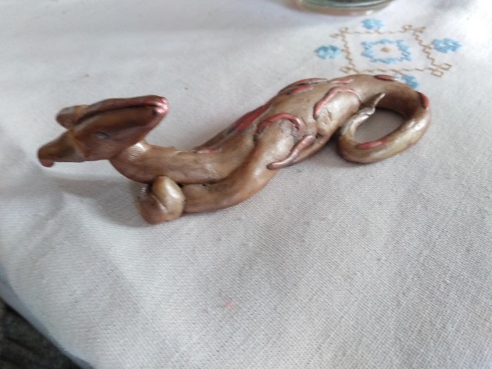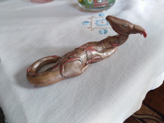 Было мне лет 7-9, мама сказала, что надо сделать бабушке подарок, а лучший подарок-сделанный своими руками. Моей традицией делать подарки бабушке было рисовать жирафов на самодельный открытке (показать не смогу, нету нигде). Так вот, я решил закреативить и сделать подарок-скульптуру-дракона, будучи воодушвленным мультфильмов 'Шрек'. Так вот, мои детские руки старались, лепили, красили, даже залакировали и вышло это: