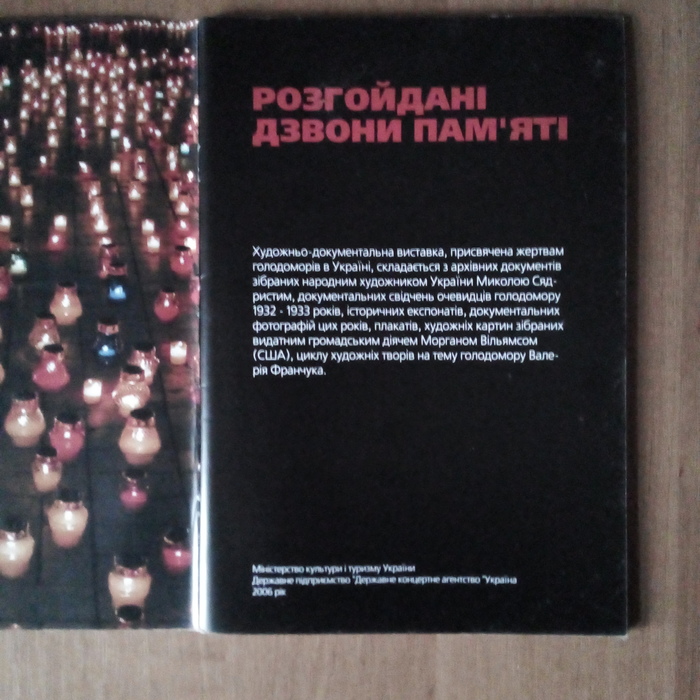 "Раскачанные колокола памяти." Художественно-документальная выставка, посвящённая жертвам голодоморов в Украине, состоящая из архивных документов собранных художником Украины Николаем Сядристым, документальных свидетельств очевидцев голодомора 1932-1933 годов, исторических экспонатов, документальных фотографий тех лет, плакатов, художественных картин собранных выдающимся общественным деятелем МОРГАНОМ ВИЛЬЯМСОМ США, цикла художественных произведений на тему голодомора Валерия Франчука.