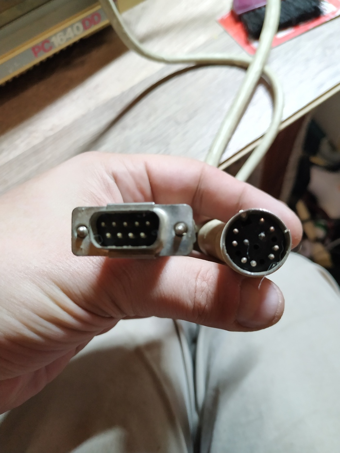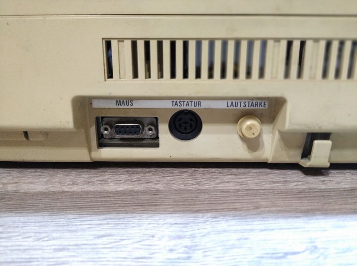 Разъёмы клавиатуры и мыши (той самой, проприетарной) и регулятор громкости ПиСи-Спикера! Я люблю амстрад! Клавиатура, кстати, тоже проприетарная.