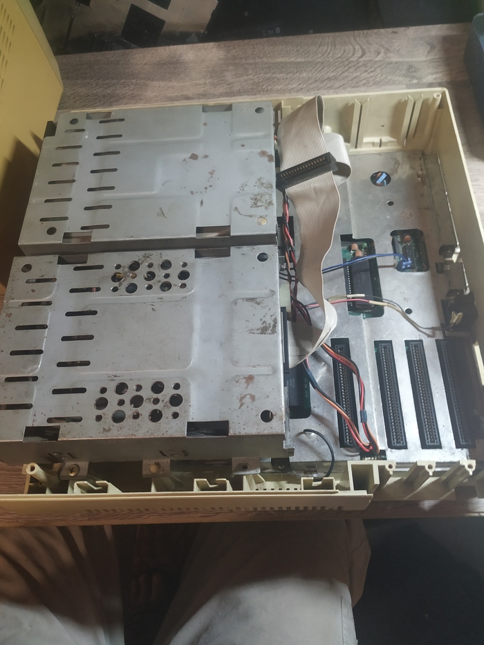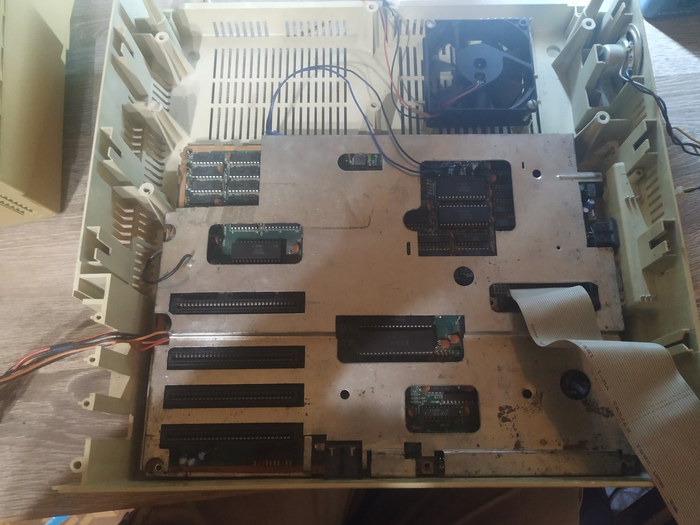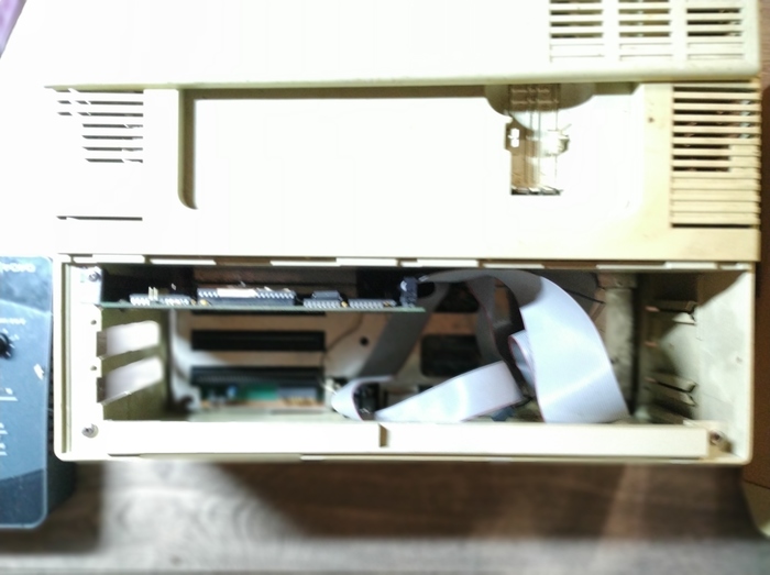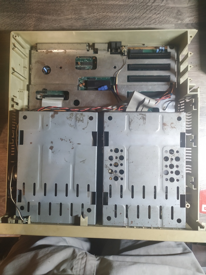 Снял крышку. Хорошо видно корзины с флоппиком и жёстким дисков. Корзина флоппика просверлена нашими умельцами для лучшего охлаждения, видимо.