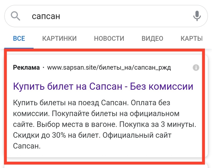 На днях я, собираясь в свою первую поездку на уже всем известном высокоскоростном электропоезде, решил заранее приобрести билет онлайн. По запросу "сапсан" Google в самом верху выдал мне рекламную ссылку на сайт www.sapsan.site: