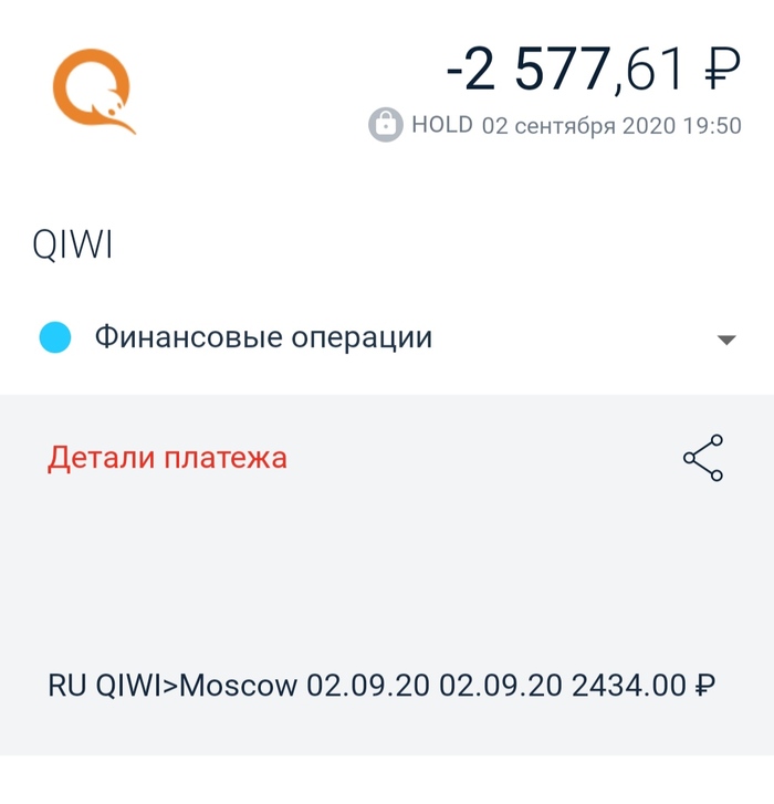 На скриншоте выше видно, что перевод средств был осуществлен через платежный сервис QIWI, и был это именно обычный перевод, а не оплата счета или услуги, так как сумма, указанная на сайте, и сумма списания отличались на некоторую величину, которая составляет определенный процент и взимается банком (или же сервисом QIWI) в качестве комиссии за перевод.