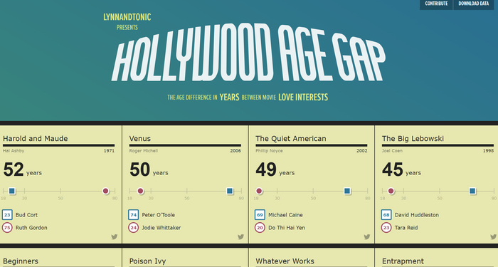 Этот сайт затрагивает важную тему возрастного дисбаланса между партнерами в голливудских фильмах, предоставляя статистику и конкретные примеры. "Разница в возрасте Голливуда" позволяет пользователям исследовать, насколько велика была разница в возрасте между ведущими актерами в различных фильмах, поднимая вопросы о стереотипах и представлениях в киноиндустрии.
