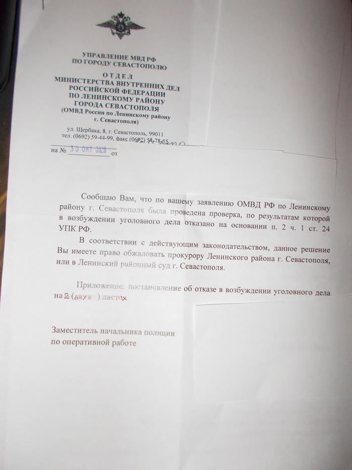 Хотел сфотографировать отказ и выложить-но сосед против. Там и его данные. Если уговорю-выложу. Вот всё что надо знать о работе правоохранительной системы. Если ты простой гражданин-справедливости добиться сложно. Это ОЧЕНЬ трудозатратно , заберёт уйму времени и нервов. И ещё и не факт что добьёшься. Можно пойти в прокуратуру и попробовать обжаловать решение об отказе от дела. Но это всё время , нервы и потерянные вследствии потраченного времени деньги. Короче сейчас справедливость-в руках самих граждан. Не дай себя обокрасть , избить и ограбить. Изнасиловать. Убить. Вот это справедливо. А ещё не болей!
