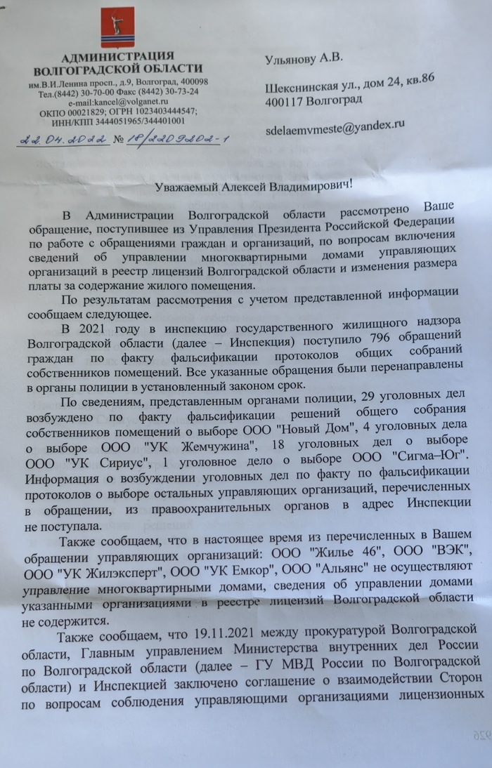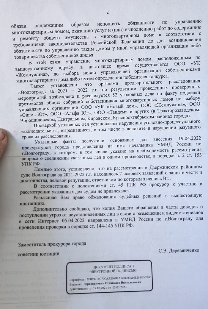 Каково было наше удивление, что Арбитражный суд в лице судьи Поповой Т.В. дав время на подготовку вопросов по экспертизе, отложившись, при собрании на новое заседание, не только не поднял вопросы по экспертизе, но и самостоятельно приняла решение, что указанный ролик https://www.youtube.com/watch?v=ANLxYh3urH8 наносит вред деловой репутации указанных УК, а в самом решении ссылается не на решение областного суда, нашу апелляцию, а на суд первой инстанции судьи Волынец. Не странно ли? Решение Арбитражного суда можно почитать тут https://disk.yandex.ru/i/x-qLSnZmyHQACw . При этом кассацию по указанному Арбитражному делу в Саратове, тоже рассматривали ни кого не слушая, мои личные ощущения, что порешали как-то. Хотя в Саратове был плюс, мы попытались предоставить в суд ответы Администрации Волгограда и Прокуратуры, где указывается сколько уголовных дел возбуждено по протоколам на основании которых указанные УК приходили к управлению. Нам отказали к приобщению. Так как решения Арбитража ВО было 14 апреля 2022 года, а бумаги датированы 28 апреля 2022 года. На момент вынесения первичного решения данных бумаг не было. Вот они: