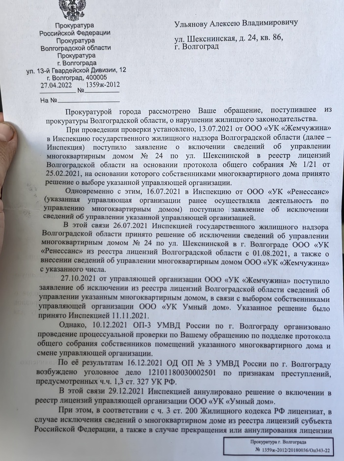 В это время мои сомнения уже подтвердились, Прокуратура Волгоградской области прислала ответ в котором указывает на возбуждение уголовного дела по протоколу на основании которого УК "Жемчужина" приступила в управлению моим домом по ст. 327 УК РФ.