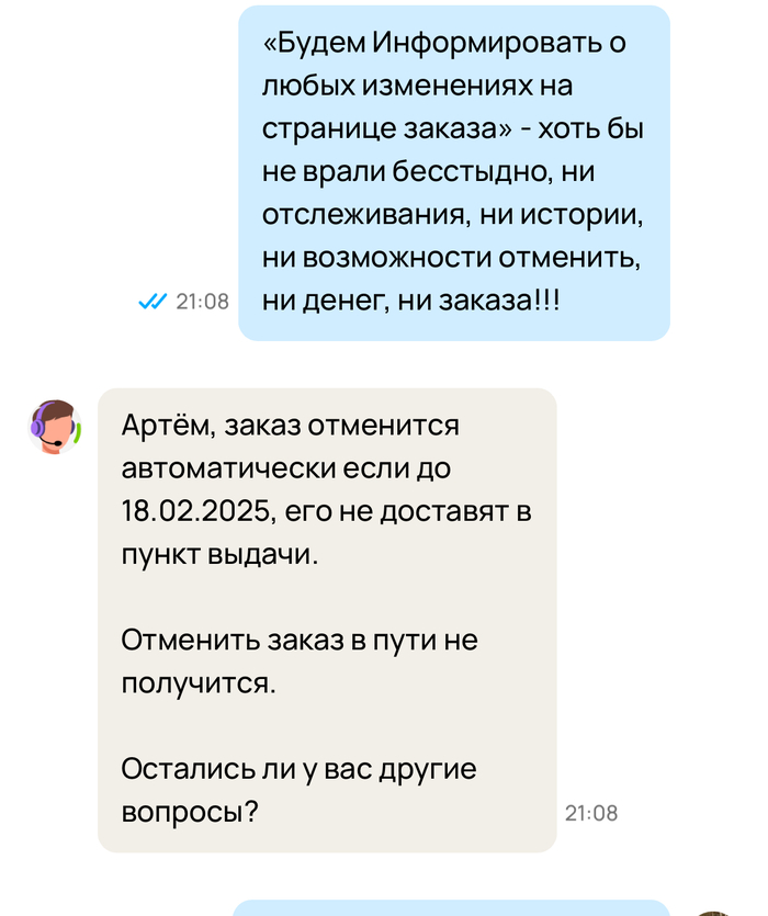 Написал в поддержку, попросил отменить заказ, на что поддержка резонно ответила, что может отменить его только по прибытию в пункт выдачи.