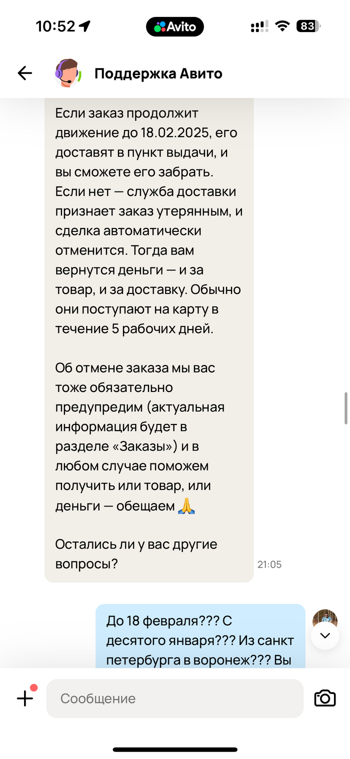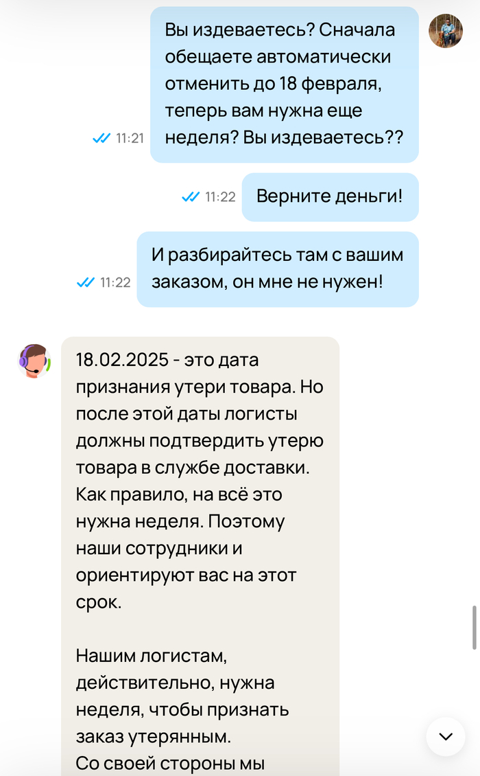 Итак. Барабанная дробь. Третье февраля. Заказа нет. Вечером в 20:35 я пишу им сообщение и получаю первый шаблонный ответ.