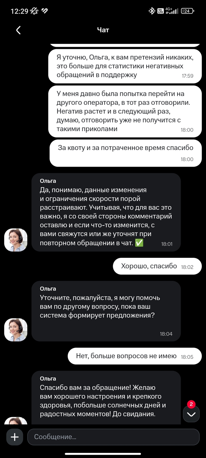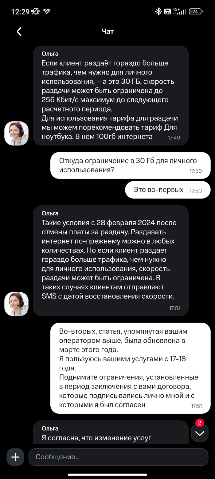 Заехал 24 октября, 27 октября во время просмотра хоккейного матча с участием моей любимой команды приходит смс с оповещением и снижении скорости до 256 кбит. Я просто охуел. Нет, я ОХУЕЛ. Решил, что изъебу им все мозги во время перерыва между периодами. Немного подергавшись, первый оператор ушел в закат. На смену ему пришел другой. Поняв, что я настроен очень категорично, оператор Ольга, цитирую, "обновила квоту раздачи". Возможно, я неправильно ее понял. Но в моем понимании мне просто дали 30 гб сверху.
